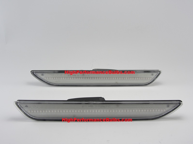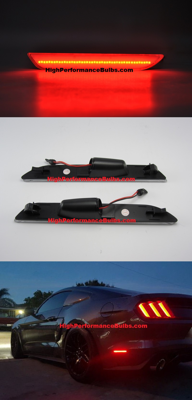 Upgrade your dim dull factory standard bulb rear side markers to our new 2015 2016 2017 2018 Ford Mustang Clear Lens Red LED side markers for a custom modern look and better visibility! The Clear lens looks great on many different colored Mustangs, especially white and silver, for a custom look and brighter visibility at night! With 48 high quality super bright LEDs the length of the light, these will give your Mustang a great clean custom and modern look during the day and at night!