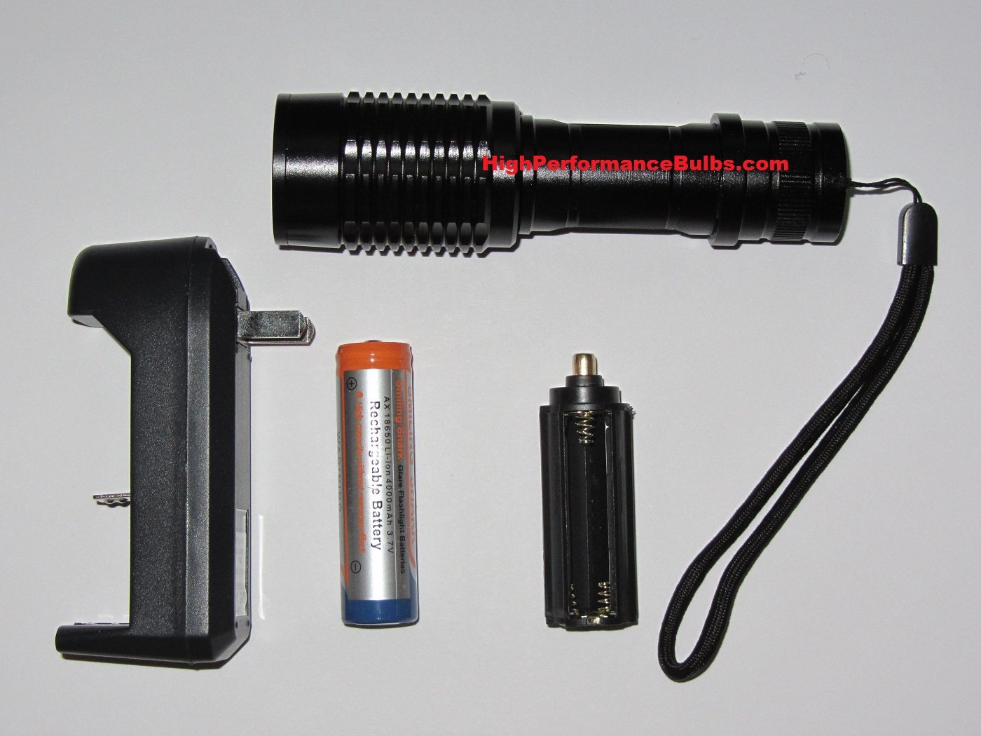 Using CREE's high output T6 LEDs this flashlight will blow you away with its 900 Lumen output with the included long lasting 18650 Lithium Ion rechargeable battery, or you can maximize the light output up to 1200 Lumens using the included 3 AAA battery adapter. Either way you will have a super bright LED flashlight that is easy to store in small places, uses very little power and provides unparalleled light output!