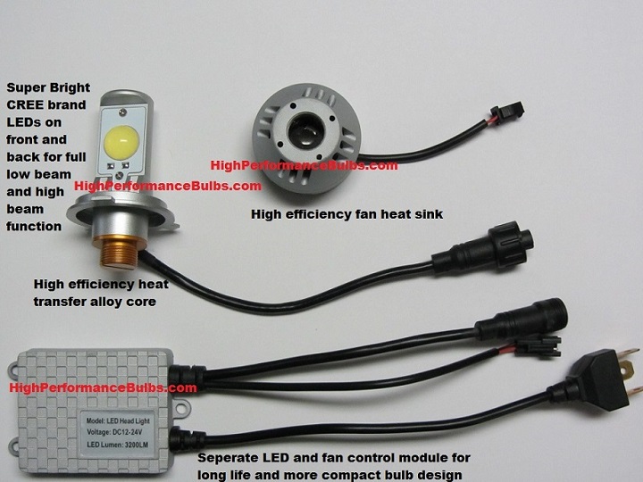 If you are looking for a real bright usable H4 LED headlight bulb for your motorcycle, look no further. Our New Super High Output H4 LED Motorcycle Headlight bulb kit will convert your H4 halogen headlight to a very bright H4 LED bulb with fully functional LED low beams and LED high beams! The new Super High Output LEDs used in our Super High Output H4 LED Motorcycle bulb kit are very bright and produce over 6000 Lumens of light output using only a fraction of the power of standard H4 halogen bulbs or even 35 watt H4 HID kits!