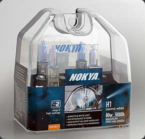 Get the HID appearance and improved visibility without the HID price! Nokya Magnum Cosmic White H1 Stage 1 and Stage 2 bulbs are a high output halogen headlight upgrade. They give you the European white light (euro style) seen on most import cars. These bulbs improve driver visibility and awareness by producing a whiter light then conventional halogen bulbs. The light produced is at the 5000K range which is very close to light produce by the sun. These bulbs are a direct replacement for stock bulbs.