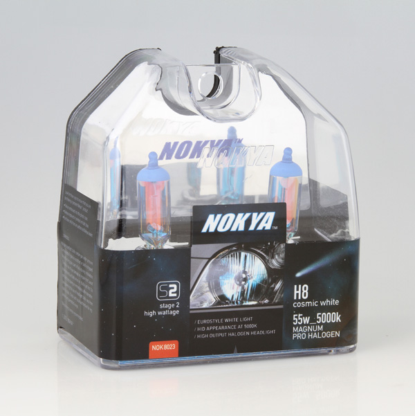 Get the HID appearance and improved visibility without the HID price! Nokya Cosmic White Stage 2 bulbs are a high output halogen headlight upgrade. They give you the European white light (euro style) seen on most import cars. These bulbs improve driver visibility and awareness by producing a whiter light then conventional halogen bulbs. The light produced is at the 5000K range which is very close to light produce by the sun. These bulbs are a direct replacement for stock bulbs.