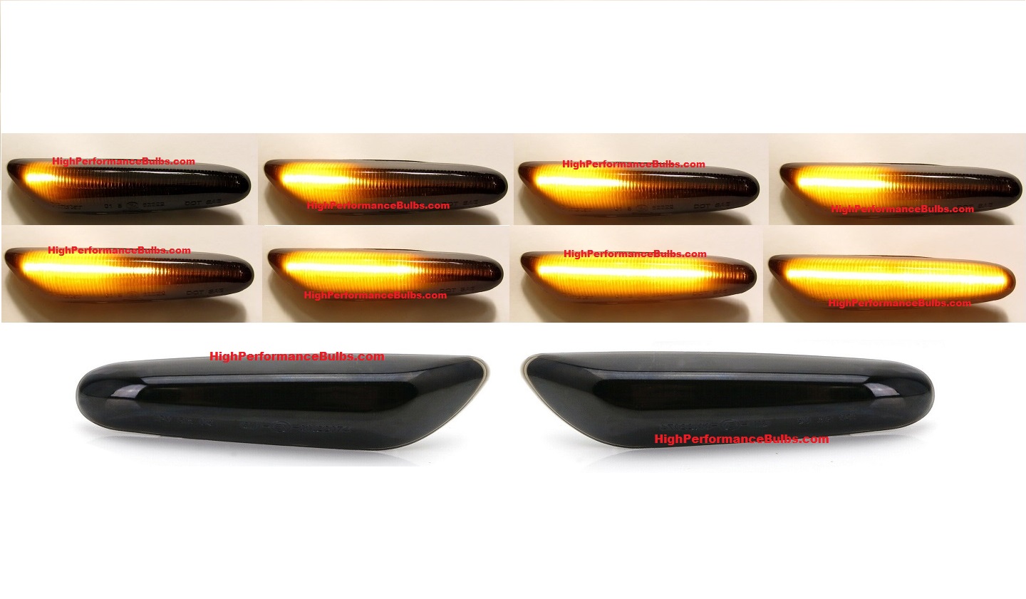 Upgrade your standard bulb side markers to our Smoked Lens Sequential Amber LED Side Markers for a stylish unique look!  With 24 super bright amber LEDs our Smoked Lens Sequential Amber LED Side Marker will provide your BMW with a show stopping look that will grab the attention of others with their unique chase style lighting.  Unlike others with standard smoked lenses, ours are faceted inside the lens to spread the light more evenly across the side marker providing a noticeably brighter and smoother look without the pinpoints of light most other brands have.  Built with top of the line LEDs and electronics our Smoked Lens Sequential Amber LED Side Marker Lights will provide years of trouble free use and super bright light output and a unique style few have.